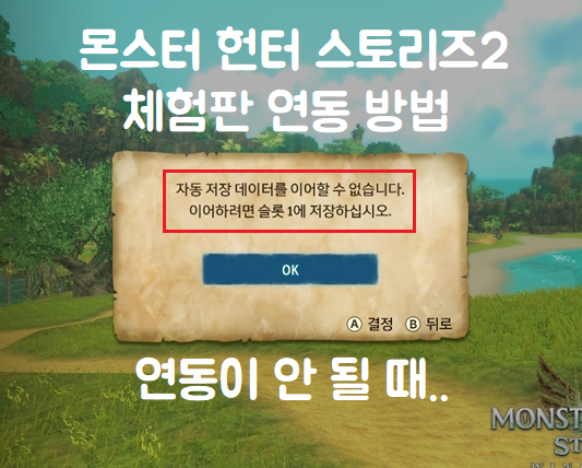 본편을 켜서 체험판 이어하기를 누르면 이런 메세지를 띄우며 연동이 되지 않습니다.