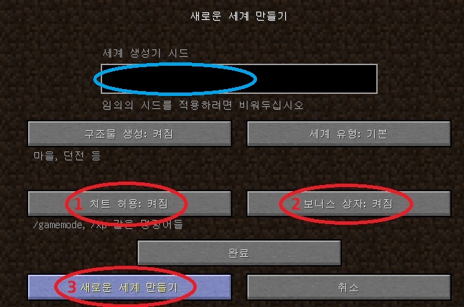 파란색 동그라미로 표시한 세계 생성기 시드에 아래 시드를 입력하면 사막 마을 스타트를 즐길 수 있습니다.